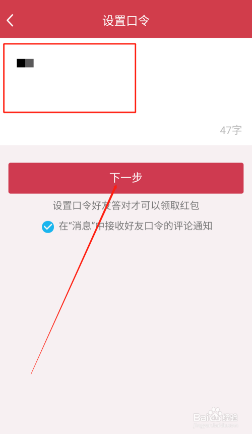 进入QQ空间口令红包的口令设置页面后,在编纂栏内输入设置的口令,点击下一步,进入发空间红包页面。