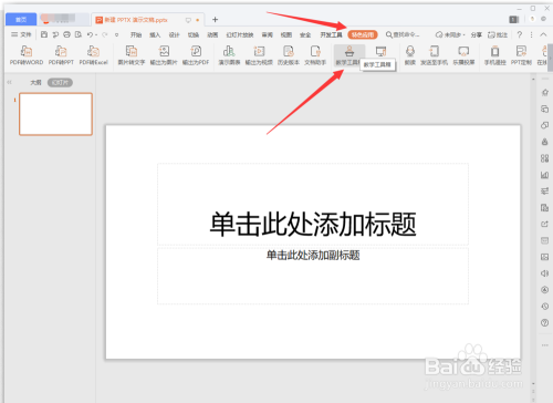 2、打开wps演示文稿后选择”特色应用“下面的”讲授东西箱“