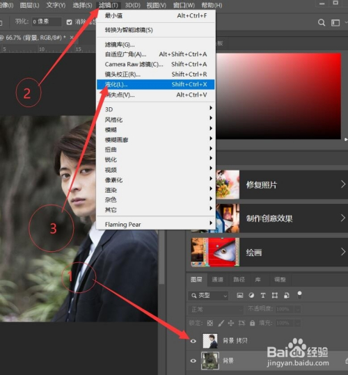 接着显示出人物图层,将人物标的目的中心移动,然后执行【滤镜】→【液化】,如图