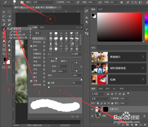 接着选择一个笔刷,然后在蒙版长进行涂抹出结果,必然要在蒙板上涂,如图