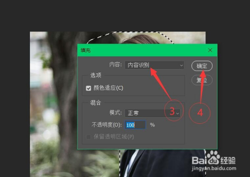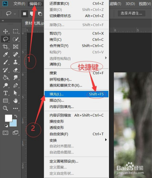 接着选择布景图层,选择【套索东西】选出人物部门,然后执行【编纂】→【填充】,或者直接按下【Shift+F5】,如图