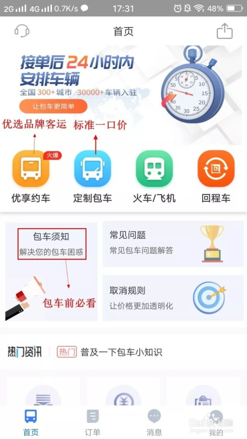 下载软件后利用手机号码进行注册登录。进入首页,请选择包车类型,若有疑问,可查看包车须知。