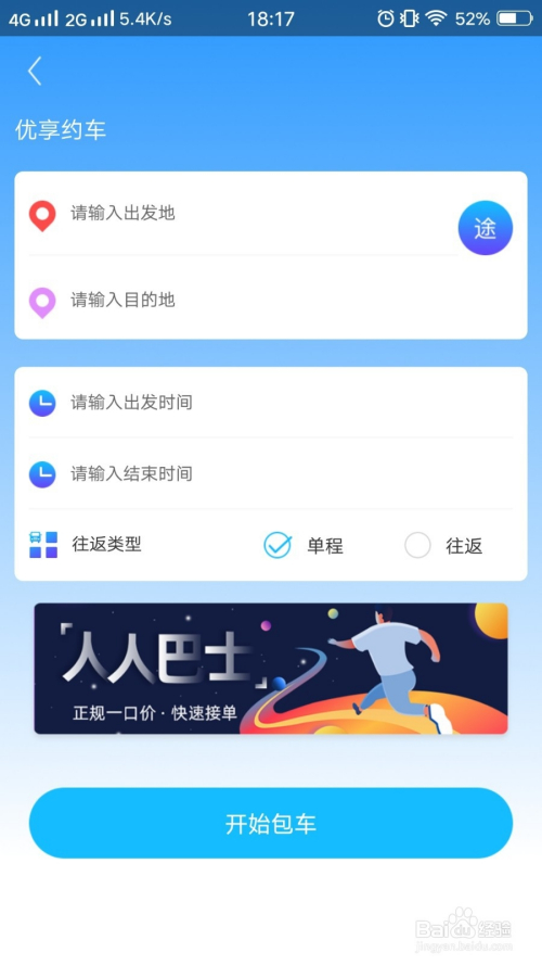 人人巴士是一条目“查询尺度包车资用”和“在线预定酒店车辆”的软件,本家儿要流程分5步: