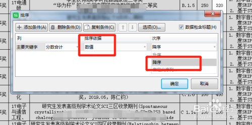 确定排序依据为“数值”,选择排序的挨次为升序或者降序
