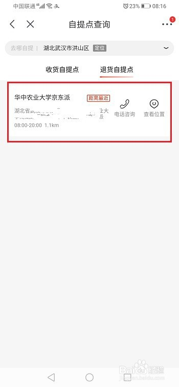 第四步点击退货自提点,可以看到位置,也可以打德律风咨询一下,如下图所示: