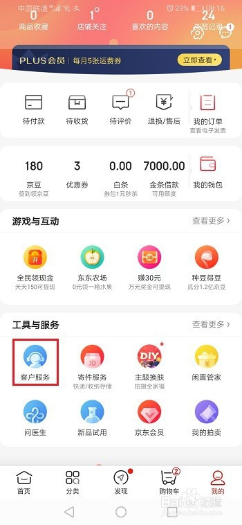 第一步在我们的手机上打开京东,进去我的界面,点击客户办事,如下图所示: