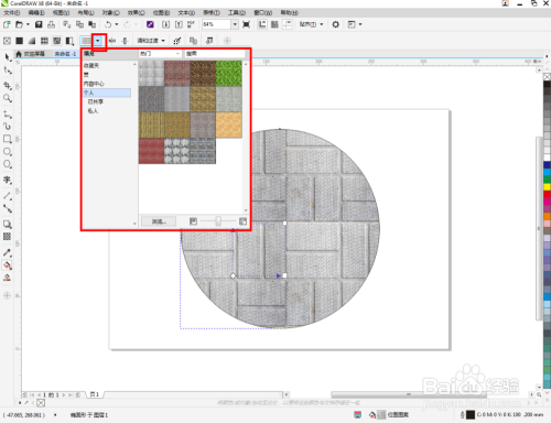 点击【交互式填充东西】-【位图图样填充】,点击【填充遴选器】,弹出填充遴选设置栏;
