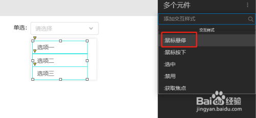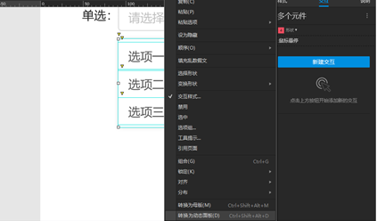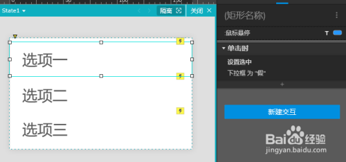 1、同时选中三个选项的矩形框,然后点击新建交互,选择鼠标悬停