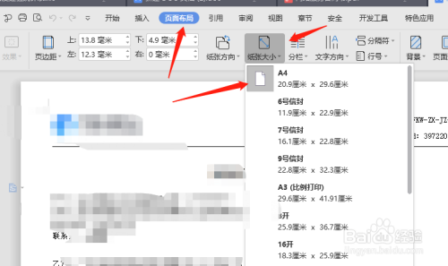 接下来点击word上面菜单栏中的“页面结构”,将纸张大小设置当作A4。