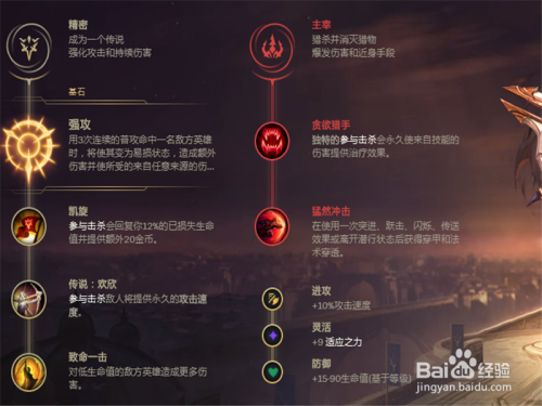 本家儿符文方面选择紧密,依次选择强攻,凯旋,欢欣和致命一击,强化进攻,这样结果很是好,并且答复能力一流。
