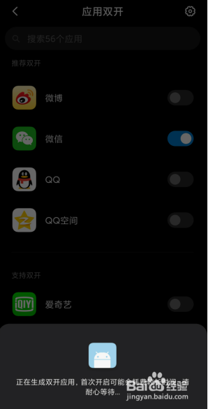 之后我们进入“应用双开”的界面,我们找到微信的选项栏,然后大师点击后面的按钮即可,然后会呈现如下图所示的提醒。