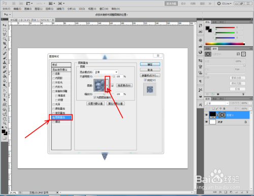 勾选【图案叠加】,点击图示小三角,弹出图案选项栏;