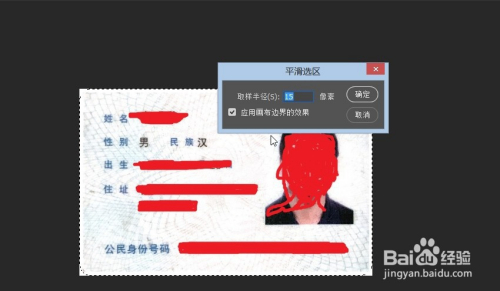 圆角处置。选择---点窜---光滑 ,弹出框中输入半径15---确定,这时,图片周围呈现圆角,如图 。( 注重不要点击图片,否则蚂蚁线就消逝了,若是消逝了,就选择---从头 选择即可)。