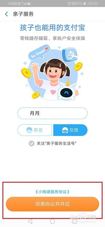 第五步输入孩子的名字,点击赞成和谈,然后就当作功开通了小荷包,开通了之后,可以进行存入和掏出,如下图所示: