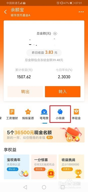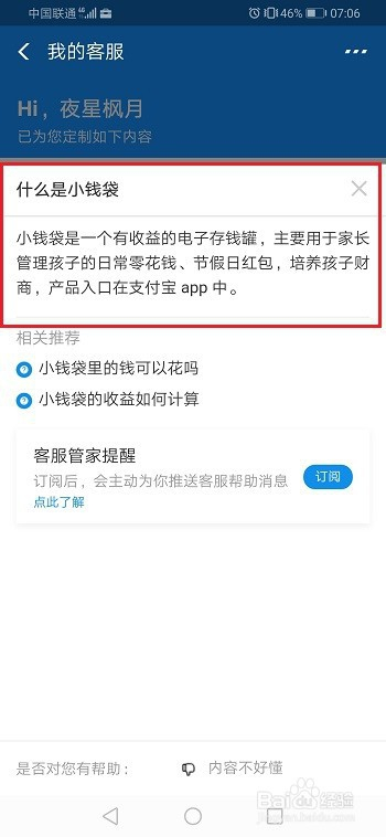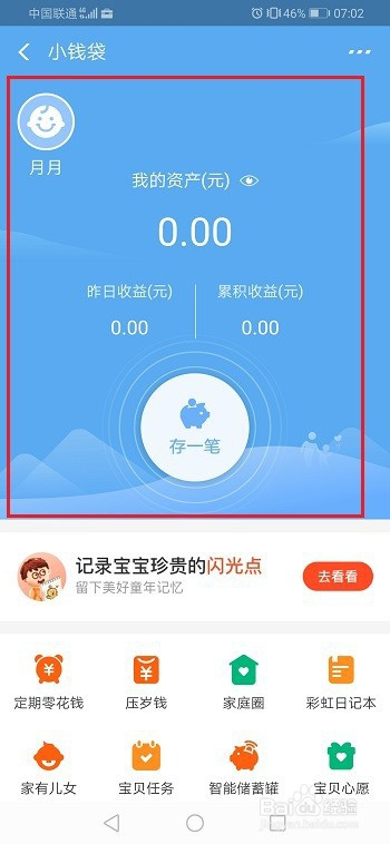 第一步我们首先需要知道支付宝小荷包是一个有收益的电子储钱罐,本家儿要用于家长办理孩子的零花钱,红包等,如下图所示: