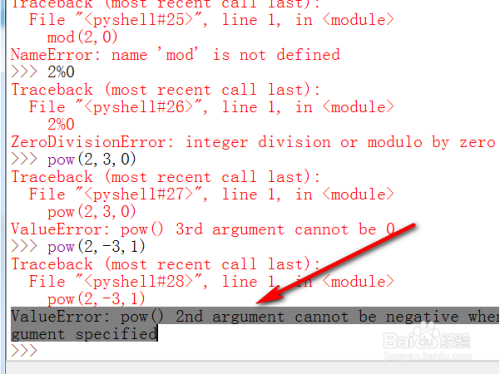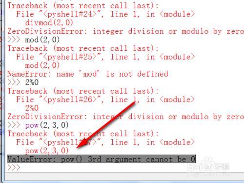 对于 int 操作数 base 和 exp,若是给出 mod,则 mod 必需为整数类型而且 mod 必需不为零。pow(2,3,0)是错误的写法,会报错ValueError: pow() 3rd argument cannot be 0