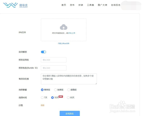 进入在线签名页面,按照页面提醒将IPA文件拖至虚框内,然后填写应用名等信息(可默认不填),然后选择签名的类型和时候,点击“在线签名”