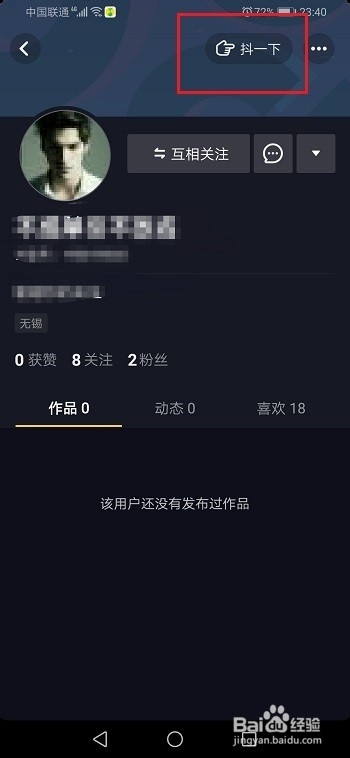 第三步进去对方本家儿页之后,点击上方的抖一下,如下图所示: