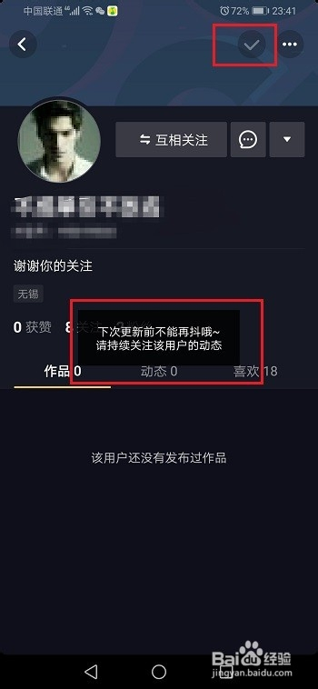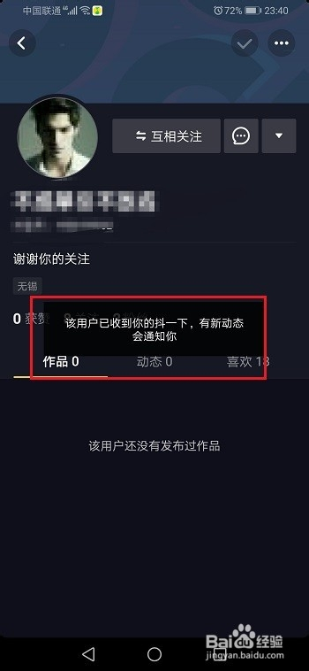 第一步我们首先需要知道抖音抖一下可以发通知对方,也可以存眷对方的动态更新,如下图所示:
