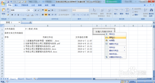 然后选按钮【B1输入列举文件名】右键菜单选“复制”,在旁边G2单位格处右键菜单选“粘贴”生当作新一个按钮【B1输入列举文件名】,选该按钮右键菜单“编纂文字”改为【B3下列EXCEL文件、B2保留路径批量存文本】,如下图