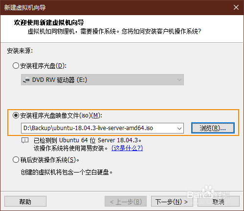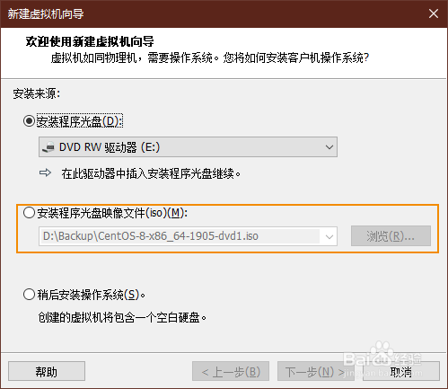 然后在呈现的【新建虚拟机标的目的导】中选择利用程序光盘、安装程序光盘映像文件或稍后安装操作系统,一般虚拟机安装利用光盘映像文件(iso)最便利,也可以直接从网上下载到。