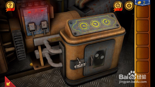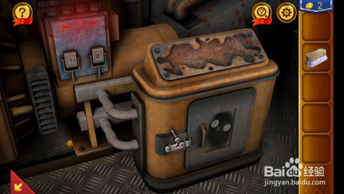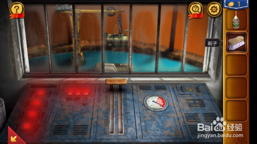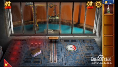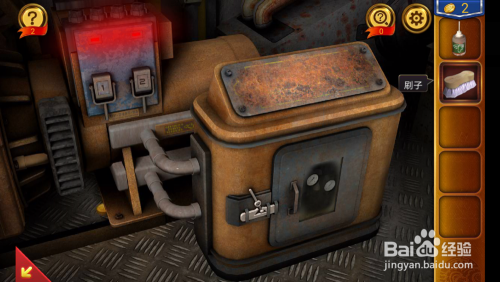 点击右面的操作台,将上面的刷子拾取起来,点击右前方的设备,操纵机油和刷子擦拭铭牌并记住铭牌图形。