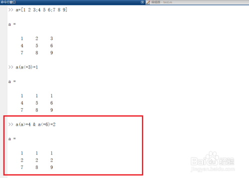 第三步输入a(a>=4 & a<=6)=2,将a矩阵中大于等于4和小于等于6的元素替代为2,如下图所示: