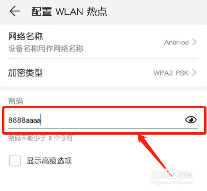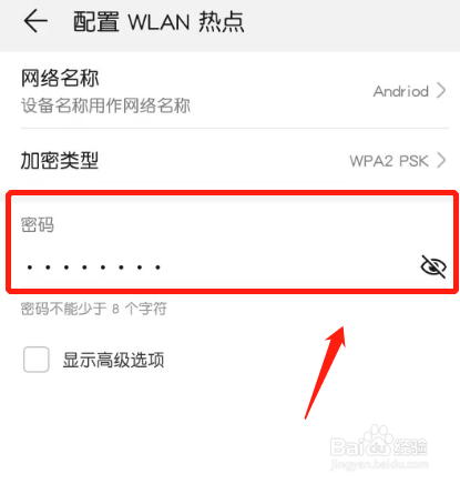 设置装备摆设WLAN热点页面中,点击密码后面的眼睛按钮,这时会显示原密码。然后删除原密码,输入新密码。