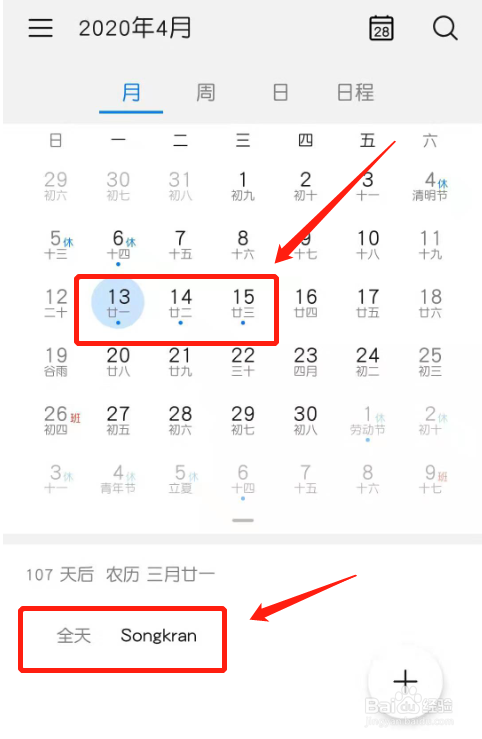 这时返回日历中就可以看到泰国的节沐日了,例如4月13-15号是泰国的宋干节(泼水节)持续进行三天。