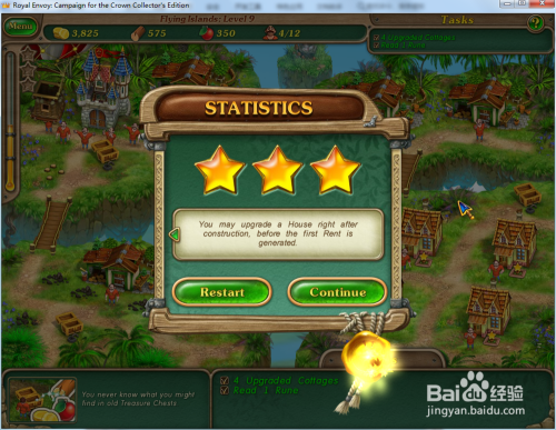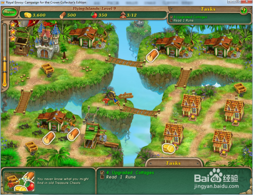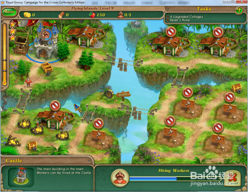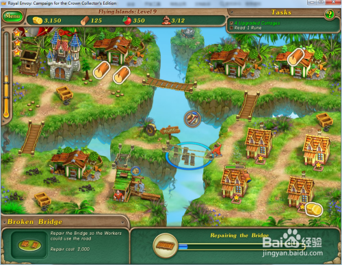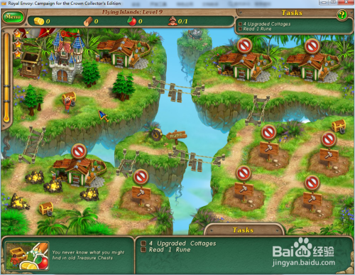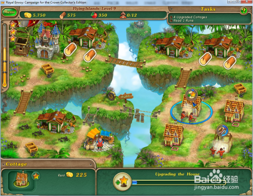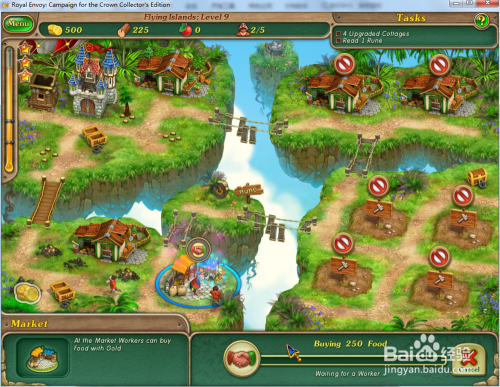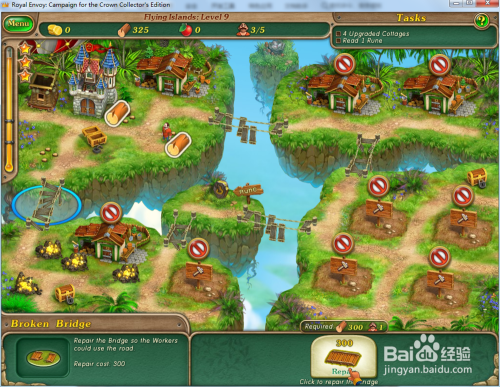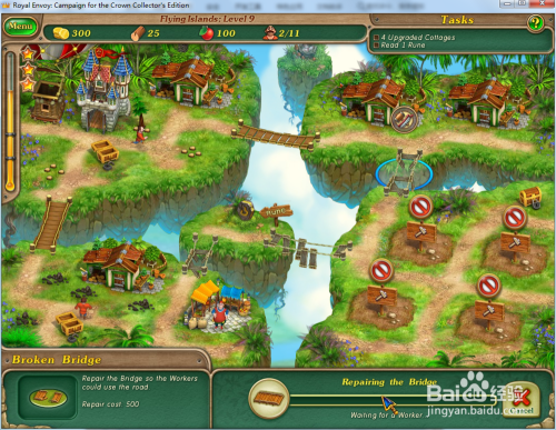 修复上方的木桥,然后操纵工人在右下方的空位上建造4座小屋并进级小屋。