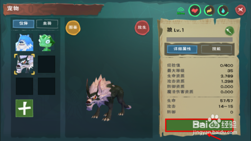点击本家儿界面菜单选项,选择“宠物”后点击“伙伴”,找到狼后点击“呼唤”,退出界面。之后点击快捷呼唤建就能呼唤狼伙伴了。