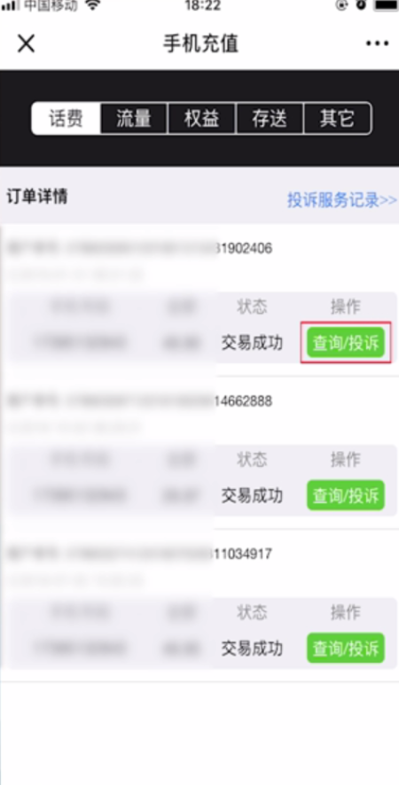 - 3找到充错的订单,点击“查询/投诉”,点击“我要投诉”。