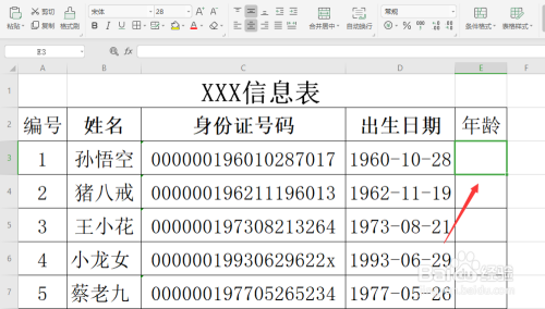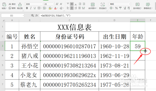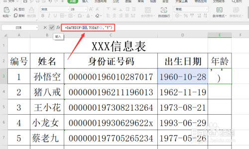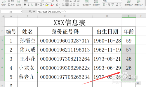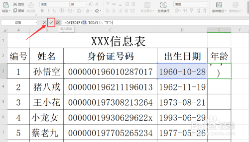 在函数框里输入公式“=DATEDIF(D3,TODAY(),"Y")”(注:利用函数DATEDIF计较两日期的差值即春秋;利用函数TODAY获取今天的日期;此中”D3“是代表D列第3行对应的单位格;“Y”是代表返回值为年份。),见下图
