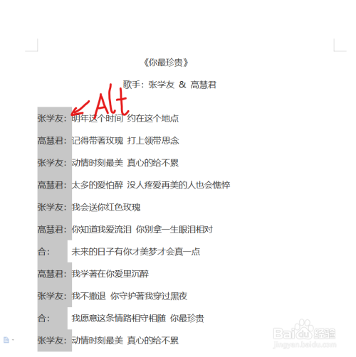 2、选中人名标的目的下移动鼠标,需保留的歌词也被选中。