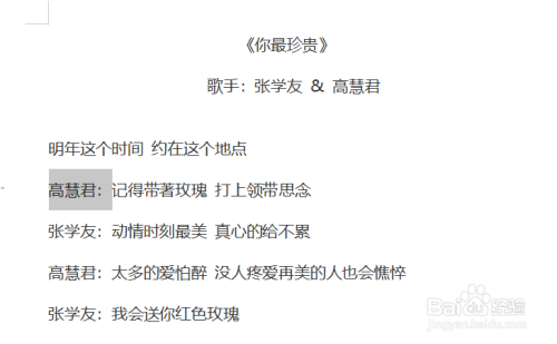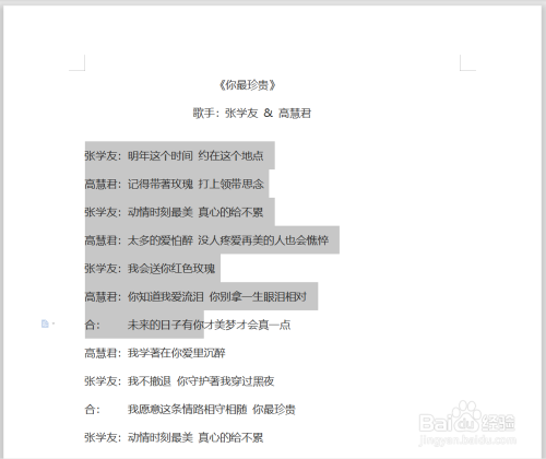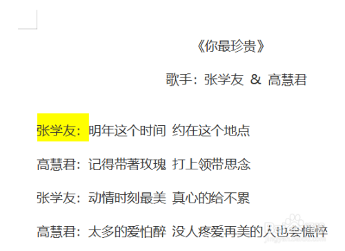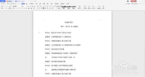 在WPS2019中打开doc文档素材,内容是一首男女对唱的情歌,我们需要将文档标明的男女分唱删除(如图中黄色部门),做当作一首完整的歌词。
