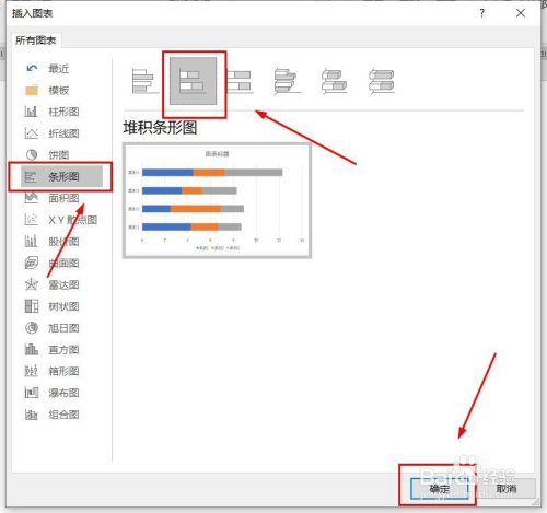 点击“条形图”,点击“聚积条形图”,然后点击“确定”。