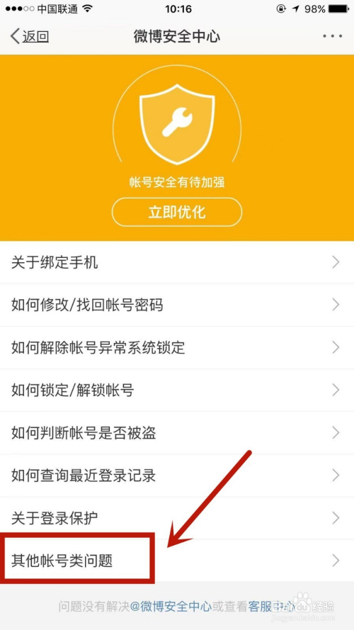 在微博平安中间页面,点击进入其他账号类问题。