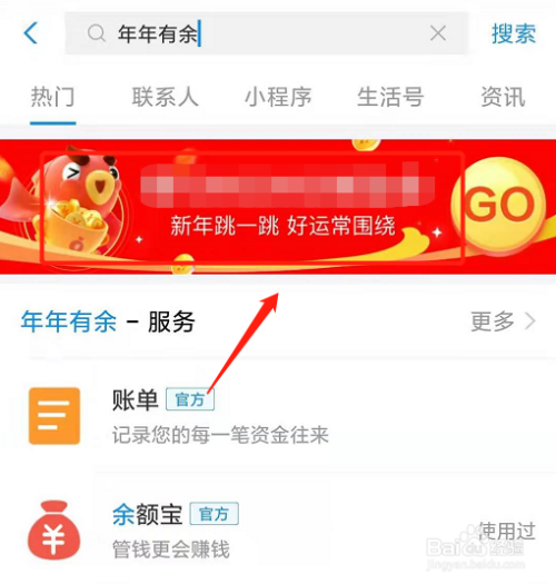 若是在首页没有找到进口,可以在上方搜刮栏中输入“年年有余”进行搜刮。如图所示