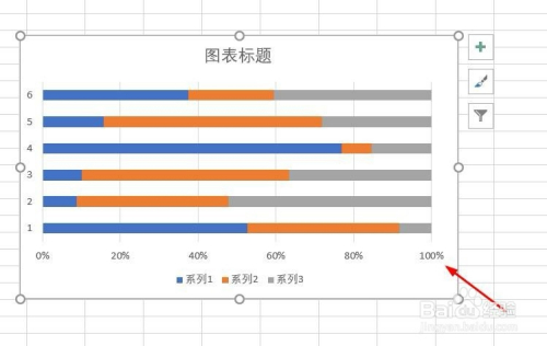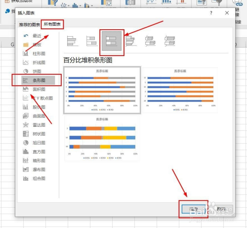 点击“所有的图表”,点击“条形图”,点击“百分比聚积条形图”,然后点击“确定”。