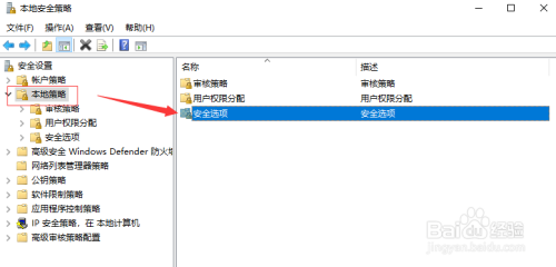 打开了当地平安策略窗口,点击左边的当地策略,然后双击右边的平安选项;