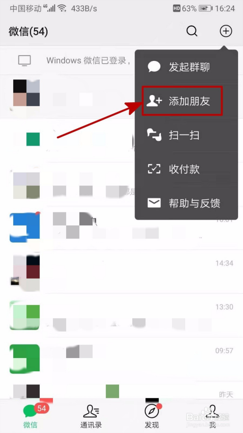 首先,打开微信,点击右上角的“+”,然后点击“添加伴侣”,如图所示。