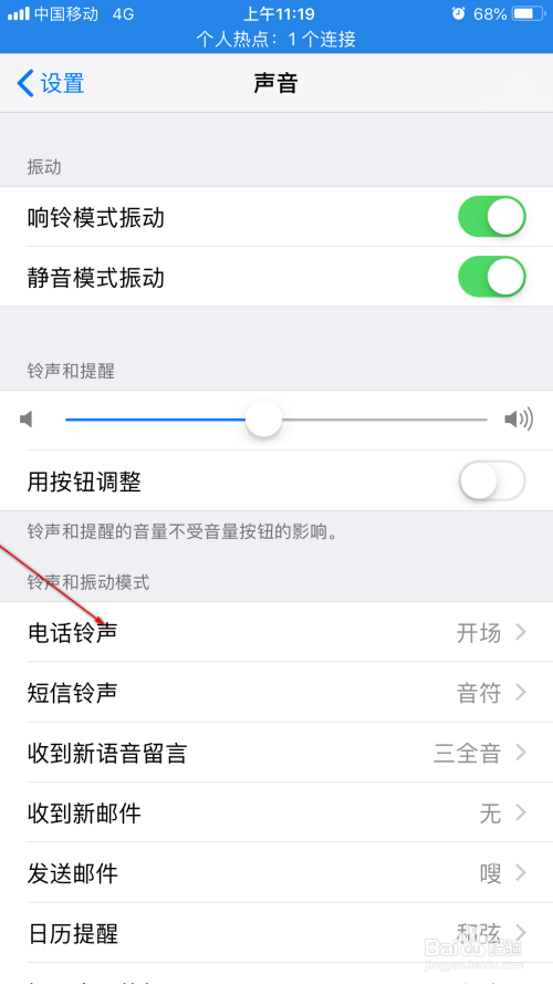 在铃声和震动模式下,可以找到德律风铃声选项,单机进入该选项,进入铃声等体例的设置