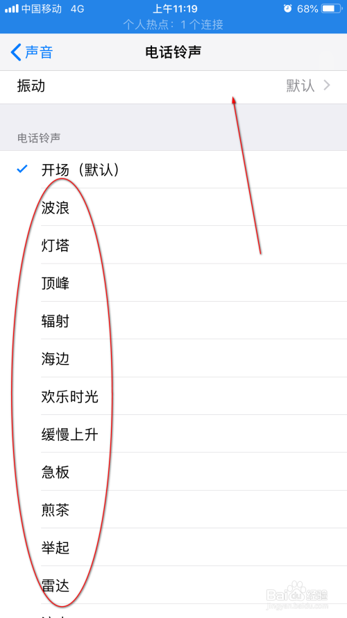 可以看到,“开场”为默认铃声,此时我们可以点击其他铃声进行试听和选择,最后选中的则为设置的德律风铃声,设置完当作后,点击上方的震动,对响铃体例进行更改