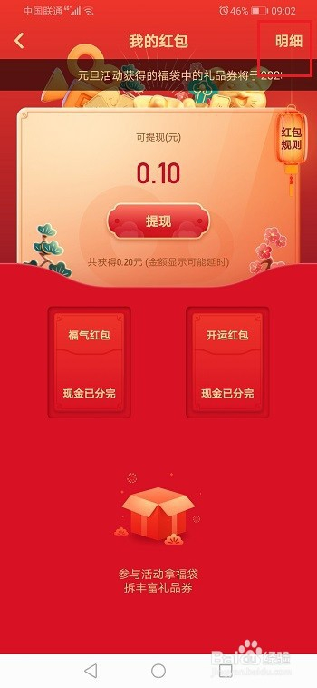 第三步在我的红包界面,点击右上方的明细,如下图所示: