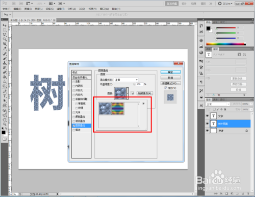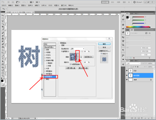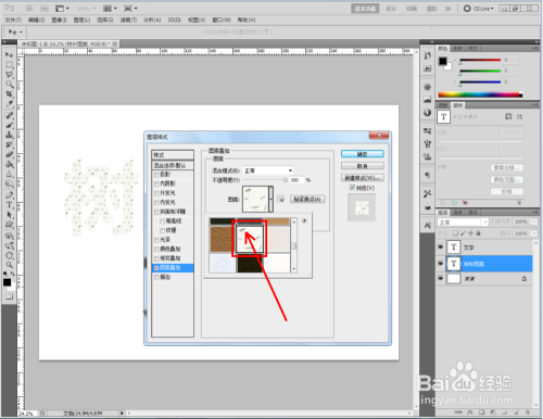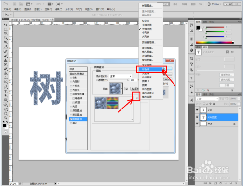 双击图示自界说图案图层,弹出图层样式设置栏。勾选【图案叠加】,点击图示小三角,弹出图案选项栏;