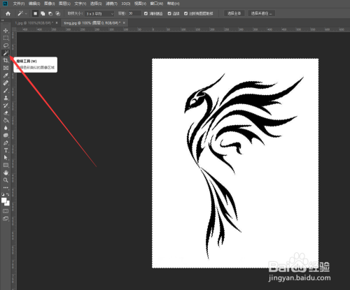 然后扭转纹身图案的图片,在右侧的图层里面会看到图层是锁定的状况,我们可以点击图标将其解锁,或者按CTRL+J复制一层。这里就以及解锁图层作为演示介绍。然后利用魔棒东西(快捷键W),在画面空白处单击,然后按键盘上Delete键删除空白区。按CTRL+D打消选择,再切换到扭转东西(快捷键V)。