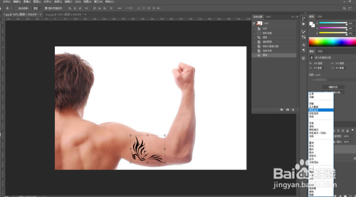 调整好今后,会看大纹身图案固然有点像了,可是很假。此时我们选中纹身图案的图层,在类型下面有个正常的图层夹杂模式,点击将其改为颜色加深,此时会看到,之前我们纹身图片的边缘以及有些接近了。可是还差了一步,是以时纹身图案是没有纹理的。