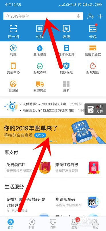 我们进入支付宝后,可以看到首页有个2019支付宝年度账单,点击进入,或者点击最上层空白搜刮处。