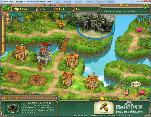 当金币达到1000时,点击上方的洞窟,操纵工人断根大门上的障碍物。