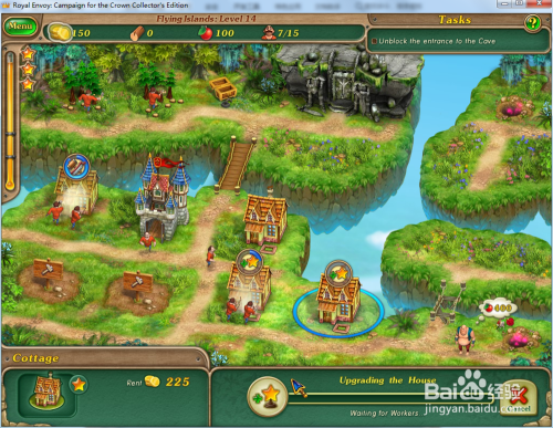 首先操纵工人打开上方的宝箱,然后再操纵工人鄙人方的空位上建造小屋及进级小屋。